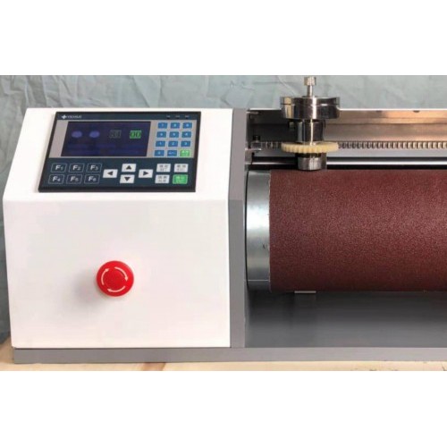 該機主要由動力系統、轉動錕筒、試樣夾轉器、自動停機系統和用于試樣轉動的齒條與小傳動齒輪裝置、基座及粉塵收集器等組成。其主要原理是:在某個載荷下,在一定級別的紗布上,柱狀試樣在紗布表面上橫切研磨一確定的行程,通過測量試樣的質量磨耗量,再由試樣的密度計算出體積磨耗量。為了使試驗有可比性,最后須得用標準橡膠,把試驗結果表示為以校驗過的紗布為基礎的相對體積磨量或是表示為相對于某種標準膠的磨耗量的耐磨基數。